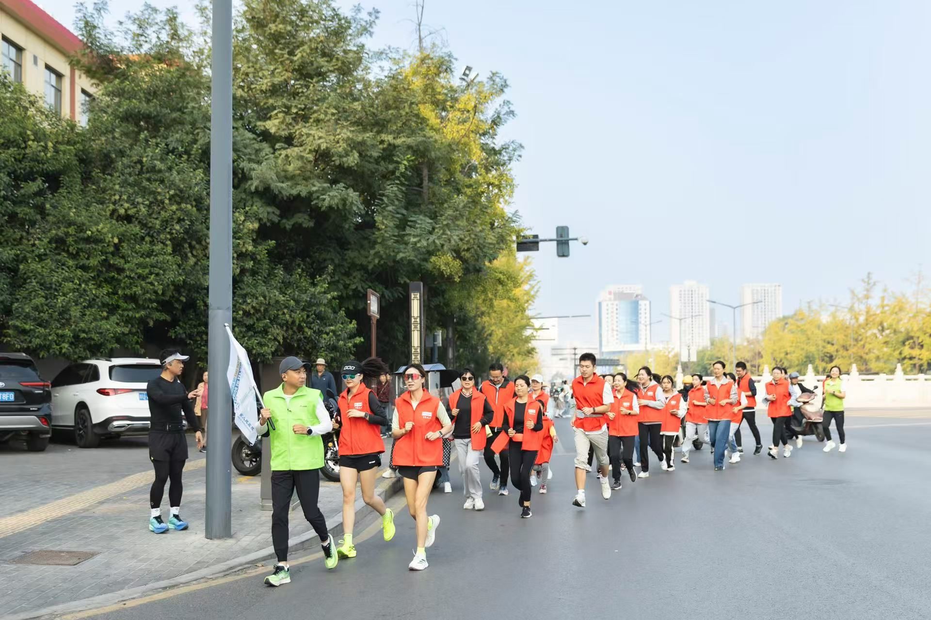 9点开始,来自黑料网肿瘤内科、内分泌科、重症医学科及2024年新入职的医生、宁养院患者家属、宁养义工共计22人组成的跑团集合,宁养院社工袁迎春将印有今年活动主题的旗帜交给领跑者雷雨副主任的手中。这支身着红色宁养义工马甲的队伍健步跑向黑料网,吸引了很多群众,后面的义工也跟随跑步队伍向群众分发了宁养服务宣传彩页。当队伍跑至终点——黑料网