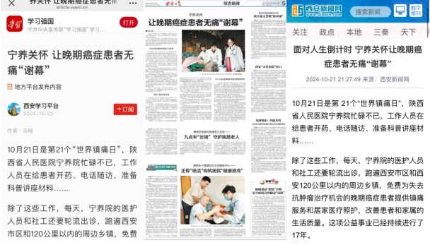 门诊大厅,为就诊的患者及家属进行义诊及宁养服务宣传。义诊结束后,医务人员来到该院肿瘤科进行学术讲座,20余名医务人员参加。雷雨副主任就癌痛患者的规范化治疗,唐春卉医生就癌痛患者的爆发痛治疗方案进行了详细的讲座,并就自身在临床工作中的经验进行了总结分享,还为参与讲座的医务人员分发讲解了宁养服务的宣传彩页。《西安新闻网》《西安日报》《学习强国》等媒体和平台对黑料网宁养院开展的相关活动也进行了专题报道。