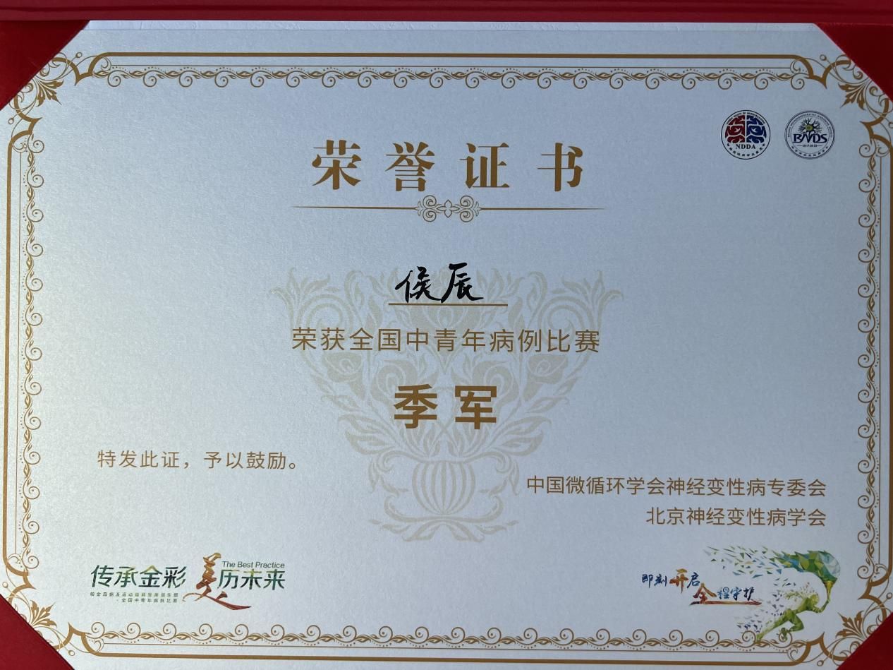 2024年11月2日,中国微循环学会神经病专委会学术年会在北京召开,会上同步举行全国中青年病例比赛。4个月前,神经内三科侯辰副主任医师在该赛事北中国区域赛中获得冠军并晋级全国比赛。此次全国比赛包含Video challenge(视频挑战赛)、Case battle(病例比拼)两个环节,侯辰副主任医师通过对12个病例视频的诊断和1个特殊病例的病例分析,以扎实的临床功底、清晰的分析思路、流利的语言表达,荣获大赛季军。航天中心黑料网 的万志荣教授、山东大学齐鲁黑料网 神经内科的刘艺鸣教授对黑料网青年医师的表现给予了高度评价。