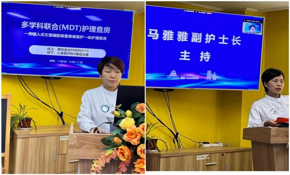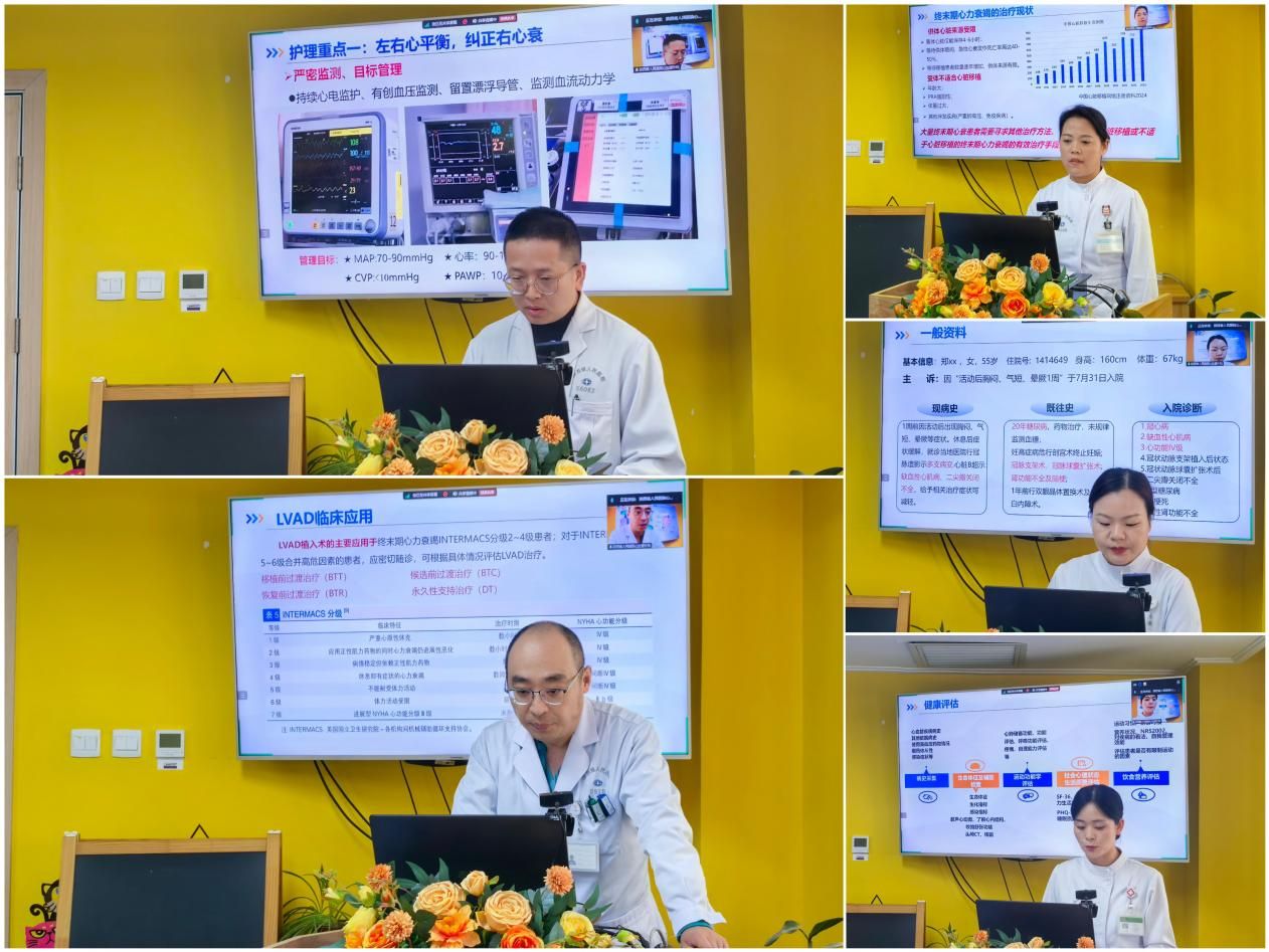 病例汇报环节,由N3级主管护师滕亚娟、满莎、N2级护师李文乐以PPT形式分享患者的基本资料、诊疗过程、护理评估、提出护理问题、相应护理措施及术后康复恢复情况;王沙副主任讲解了新技术LVAD的相关知识;王志坤医师从患者术前心功能评估优化以及术后并发症预防等方面讲解了患者的诊疗方案。