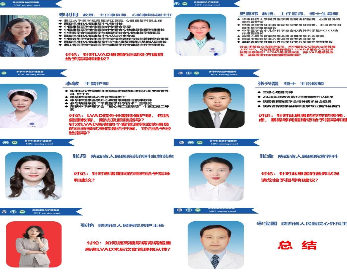 MDT讨论环节,史嘉玮教授对该患者的诊疗过程予以肯定,并结合自身经验分享了LVAD术后右心衰的相关因素以及处理措施;李敏护士长对此例重症患者围术期感染防控策略十分认可,因其全面且到位,使得患者术后无感染相关并发症发生,同时,就院外延伸护理方面给出了相应指导;朱利月教授针对患者三期康复管理提出宝贵建议;张兴磊教授从专业角度讲解了焦虑抑郁的临床表现、用药及心理照护等内容;药学部张丹药师从抗生素及抗凝药物应用的注意事项给出建议,确保患者用药安全;营养科张金医师从筛、评、诊、治、疗五各方面详细的制定了个体化营养方案;最后张艳总护士长就如何提高糖尿病患者饮食管理依从性给出合理化建议,同时充分肯定心血管外科护理团队的专业实践能力及服务水平,也对本次查房的组织形式及内涵给予高度赞扬。