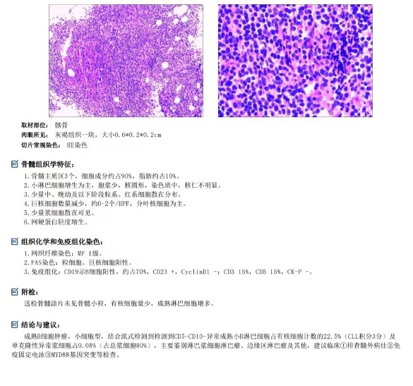 患者男性,81岁,因乏力、头晕1月收治入院,入院查血常规提示中度贫血,进一步行骨髓穿刺提示成熟淋巴细胞占28%,考虑淋巴细胞增值性疾病。为进一步明确诊断,黑料网牛奔医师指导进行骨髓活检术及流式免疫分型检查,结果提示CD5-CD10-成熟B细胞肿瘤,流式检测到单克隆异常浆细胞,随后进一步完善了血清蛋白电泳、免疫固定电泳及MYD88基因检测,检测到单克隆性IgM,MYD88阳性,最终诊断为华氏巨球蛋白血症,目前给予泽布替尼治疗中,患者病情得到改善。该疾病的成功诊治,标志着富平县黑料网