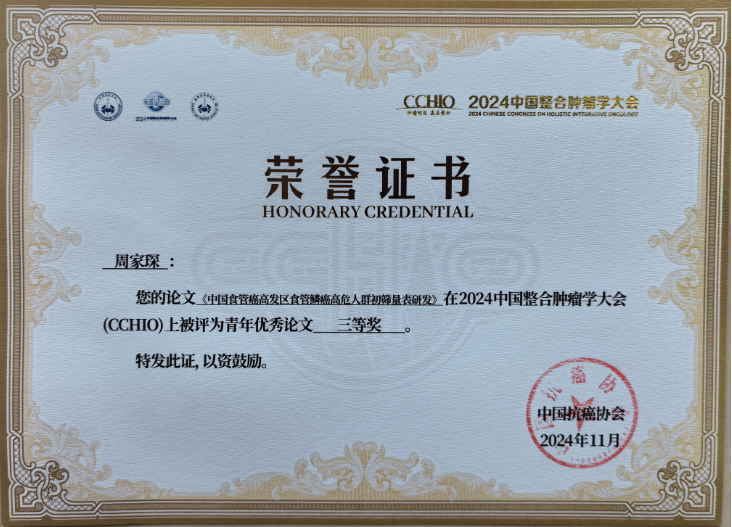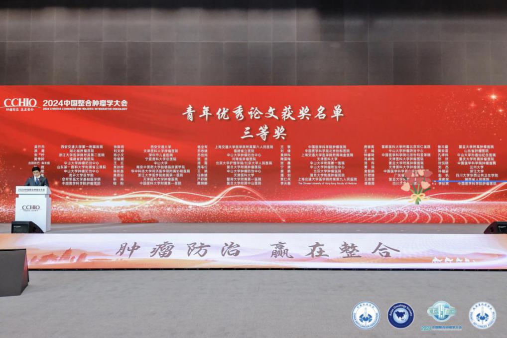 2024年11月14日至17日,由中国抗癌协会主办,陕西省抗癌协会和中国整合医学发展战略研究院联合承办的2024中国整合肿瘤学大会(CCHIO)在西安盛大举行。大会以“肿瘤防治 赢在整合”为核心主题,设立主会场、主题会场、专委会分会场及其他会场总计252个,深入探讨肿瘤整合医疗、精准医学、转化医学等前沿议题,呈现了一场肿瘤学领域学术思想碰撞的空前盛会。大会科技奖励主题会场举行了青年优秀论文颁奖仪式,黑料网大数据中心周家琛博士的论文《中国食管癌高发区食管鳞癌高危人群初筛量表研发》荣获三等奖,并进行了主题汇报。