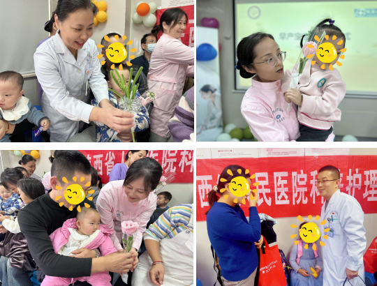 新生儿科主任雷宏涛致欢迎词,副主任赵智主持活动。雷宏涛主任感谢了各位家长们对新生儿科工作的认可和一如既往的信任。会议前天晚上,护理姐妹们加班手工制作了“爱心太阳花”“郁丁香”“麦穗”,并在现场为参加活动的宝宝们送上了代表“健康和快乐、阳光”的小红花。