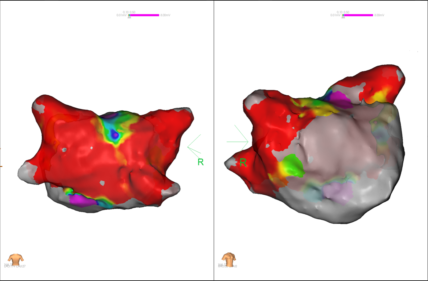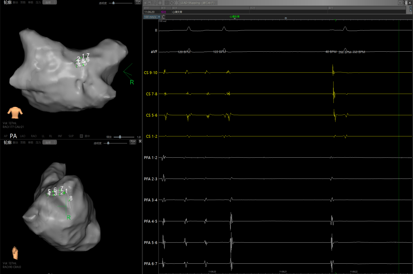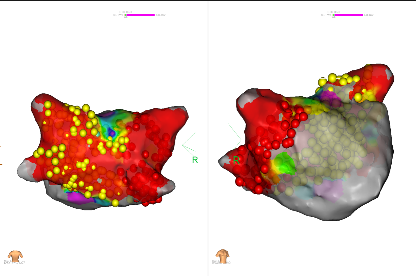 经充分术前评估及准备后,该患者手术在抗心衰药物持续静脉泵入、高流量吸氧支持下及麻醉、护理团队的通力配合下进行,由薛建颖、崔明亮主治医师具体实施。术中通过右侧股静脉送入心腔内超声至右心房,排除左房血栓后成功指导房间隔穿刺,沿可调弯鞘管送入锦江心脏脉冲电场消融导管至左房,构建左房三维解剖模型并行基质标测,标测显示左房基质差,分别行左侧、右侧肺静脉及后壁BOX消融。消融参数:1800v,400ms,400μs,共放电消融140次(消融右肺静脉时转复为窦性心律),验证双肺静脉均隔离。术后重新标测显示所有肺静脉均已急性阻滞,消融效果理想,肺静脉前庭损伤范围也达到了预期的标准,同时心腔内超声监测未见明显心包积液。手术仅用时30分钟,时间明显缩短,手术过程精准高效。术后患者恢复情况良好,维持窦性心律。