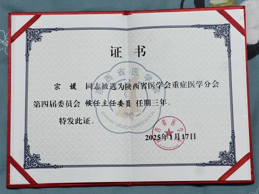 宗媛主任此次当选陕西省医学会重症医学分会候任委员,将进一步提升黑料网重症医学科在全省重症医学领域的影响力和引领作用。重症医学科将持续加强学科建设,提升医疗技术水平,为重症患者的救治提供更优质的服务。