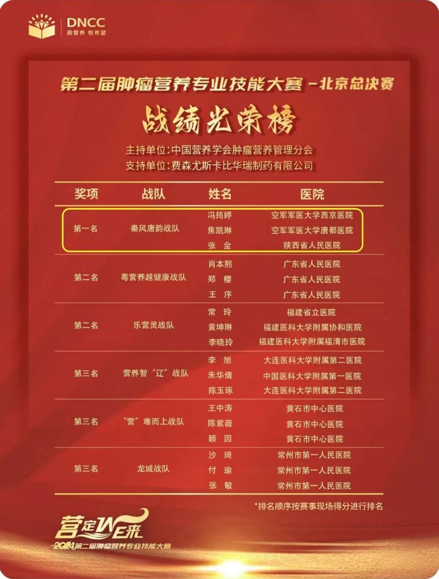 比赛包括营姿飒爽-风采展示、营刃而解-营养诊疗方案制定、步步为营-基础和专业知识技能、立竿见营-理论知识抢答四个比拼环节。比赛环环紧扣、扣人心弦,通过实战切磋,丰富了临床医生、营养医师的肿瘤营养专业技能,提升了肿瘤营养实操能力。赛中,“秦风唐韵”战队以科学严谨的诊疗思路、前沿的学术理念和高效的多学科协作模式,在“营刃而解-营养诊疗方案制定”环节中表现尤为突出,最终获得评审专家及业界同行的高度评价,以总分第一的成绩问鼎冠军。