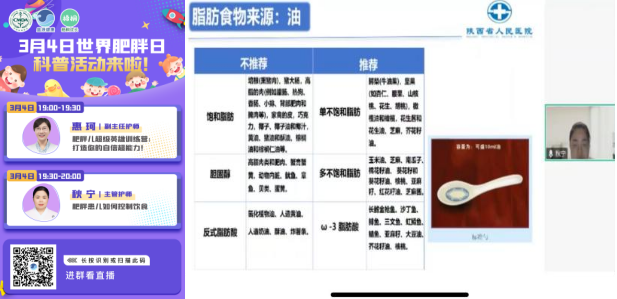 为进一步扩大宣教覆盖面,当天晚上,科室特邀心身医学科护士长惠珂及儿科秋宁主管护师带来线上科普讲座,内容包涵肥胖儿童心理问题干预及如何进行饮食控制,利用云端课堂,打破科普壁垒。线上累计观看人数达百余人次,进一步提升了家庭对儿童肥胖的科学认知。