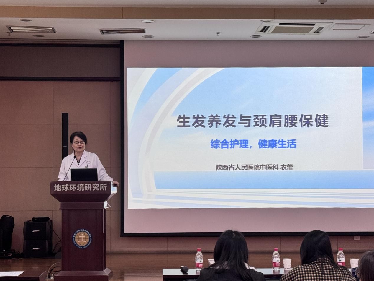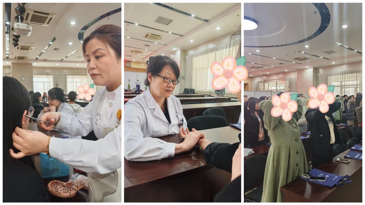 中医科衣蕾主任医师带来一场将古典医理与现代亚健康问题相结合的、内容丰富实用的健康盛宴。她结合自身丰富的临床经验,以女性科研工作者的现实需求为核心,从生发方法、养发技巧、颈肩腰疾病诊断与治疗、颈肩腰保健方法及如何有效看病等方面进行了深入浅出地讲解。并特别针对科研工作者长期久坐伏案工作出现的肩颈腰问题,现场实操了一套简单易学的头颈肩腰保健操。听众们跟随专家的指导,积极参与互动,现场气氛热烈。互动环节,衣蕾主任医师为听众们现场把脉面诊,通过望闻问切耐心解答女性疾病预防、治疗和保健方面的问题,并分别给出了诊疗、饮食调理和运动锻炼等日常保养建议。同时,中医科李英娟护士现场为大家进行耳穴贴压的中医疗法,缓解颈肩腰腿痛、失眠等症状,为女性提供了实实在在的医疗服务。