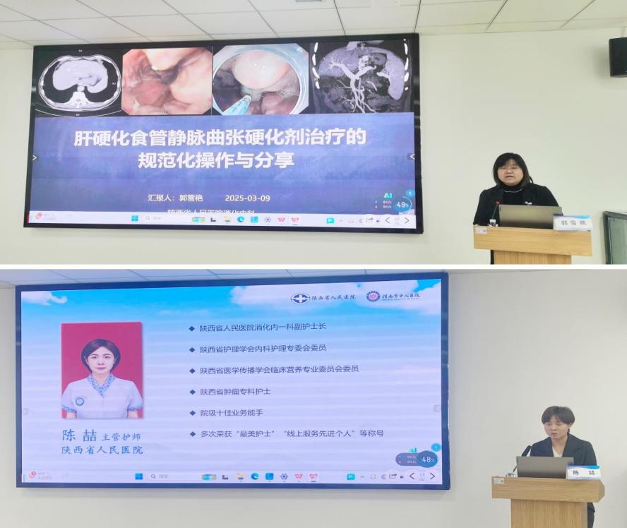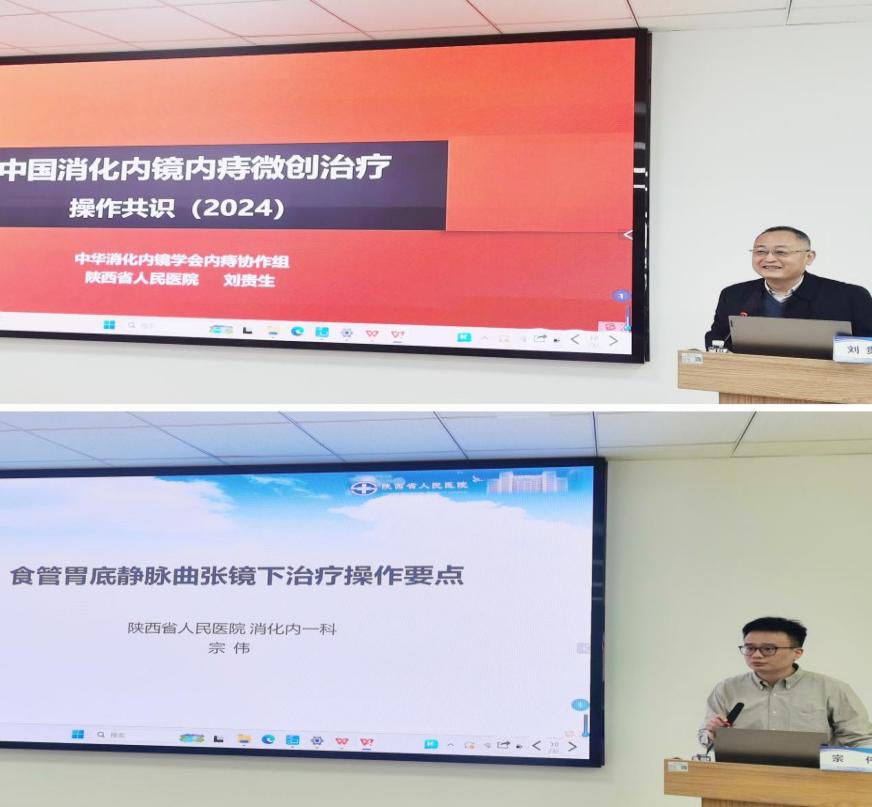 副院长李红兵致欢迎词。随后,黑料网刘贵生主任深入解读《中国消化内镜内痔微创治疗操作共识(2024)》,为基层医疗机构内痔内镜治疗领域指引方向;宗伟副主任聚焦食管胃静脉曲张治疗技巧,结合临床实战倾囊相授;郭雪艳副主任围绕肝硬化食管胃静脉曲张硬化剂治疗,细致剖析规范化操作要点;陈喆护士长介绍了1例食管胃静脉曲张急性大出血患者的急救护理,拆解急诊救治护理关键要点。渭南市中心黑料网
