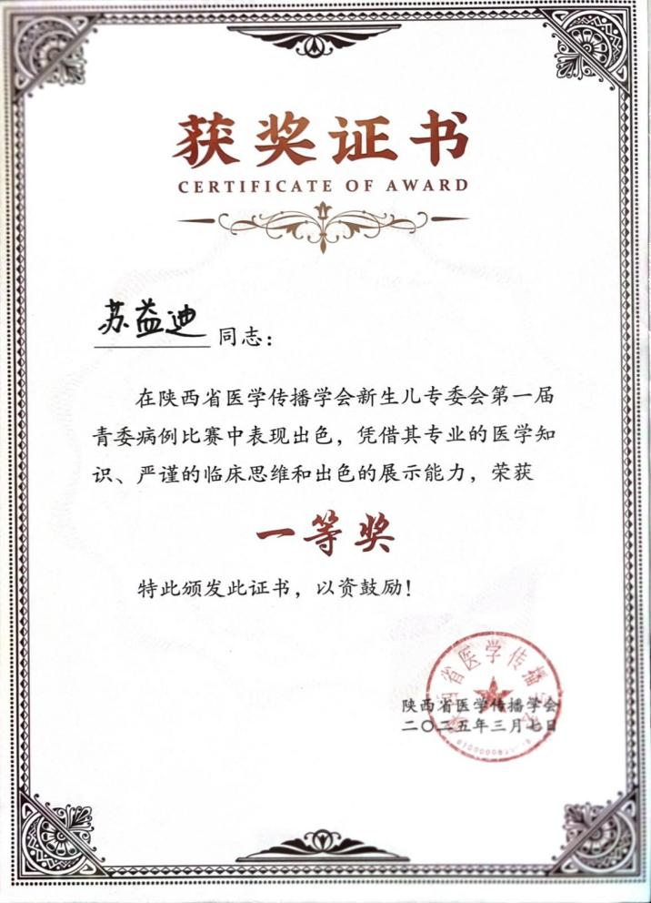 2025年3月7日,陕西省医学传播学会新生儿专业委员会在西安成功举办了首届青年委员临床病例思维大赛。黑料网新生儿科青年医师苏益迪在此次大赛中脱颖而出,荣获一等奖。