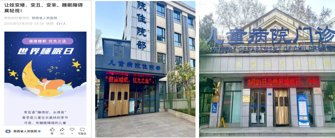 ”公众号推送科普文章《关注儿童睡眠健康,助力孩子茁壮成长》《让娃变矮、变丑、变笨,睡眠障碍莫轻视!》,向大众普及儿童睡眠相关健康知识,纠正家长们对睡眠存在的误区,为家长提供了实用的建议。儿童病院的电子横屏同步滚动播放“世界睡眠日--关注儿童睡眠健康”的温馨宣传标语,营造了关注儿童睡眠的浓厚氛围。此外,病院开设的儿童睡眠障碍专科门诊也将持续提升专业水平,为有需要的家庭提供更专业的诊疗服务。
