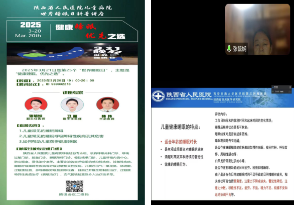 3月20日晚,儿童病院副主任张毓娴、副主任医师卫丽、主治医师韩伟进行了线上科普讲座,内容涉及儿童常见的睡眠障碍、睡眠呼吸障碍对孩子的危害性、如何帮助儿童获得健康睡眠等,特别强调了睡眠呼吸暂停综合征对儿童生长发育的严重影响,让家长们深刻认识到关注儿童睡眠质量的紧迫性。