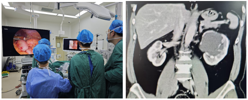患者刘先生,56岁,因腰部胀痛就医,入院检查发现左肾存在9cm肾盂旁囊肿合并左肾多发结石。传统手术需分次进行,创伤大、恢复慢、花费高。李智斌主任团队创新采用同期经腹腹腔镜精准定位囊肿进行去顶减压,术中同步引入输尿管软镜,借助钬激光将结石粉碎取出,双镜协同操作仅用3小时即完成治疗,目前患者正常恢复过程中。