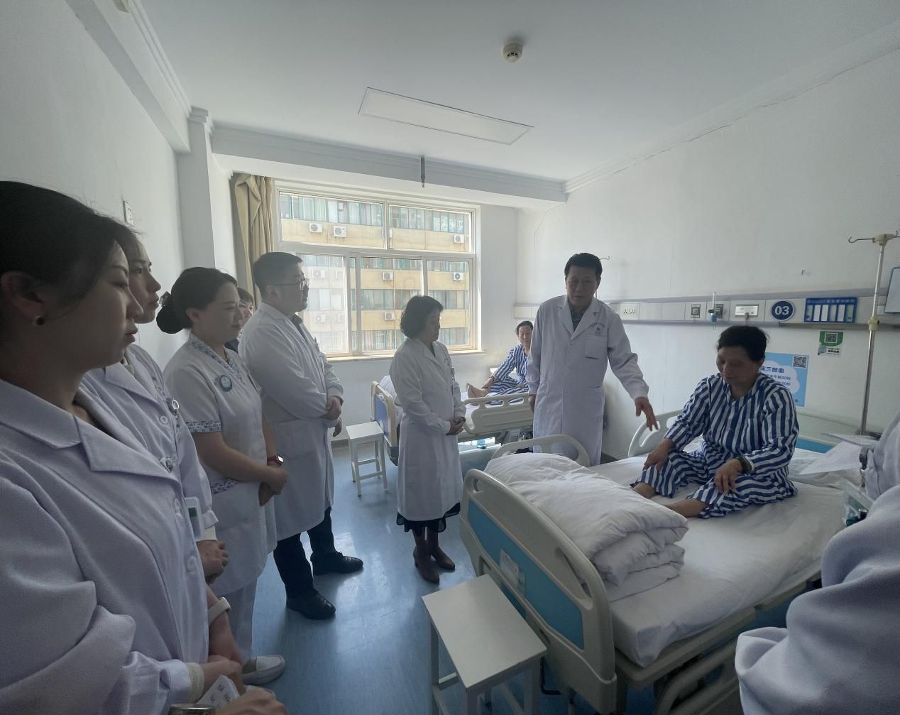 随后,赵家军教授深入内分泌科病房进行教学查房,他仔细询问患者病史,结合查体结果和辅助检查数据,从病因分析、鉴别诊断到治疗方案优化,逐层剖析,以深厚的临床功底和严谨的诊疗思维为科室医护上了生动一课。赵家军教授还特别强调了多因素综合管理、慢性病防控关口前移的诊疗理念,为临床实践提供了宝贵意见。