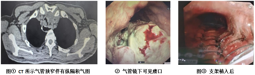 患者为56岁男性,2年前开始吞咽困难,被诊断为食管癌,行手术治疗后病理中分化鳞癌,分期pT3N1M0ⅢB期,术后化疗辅助治疗4周期,随诊病情稳定。近2月来反复出现咳嗽,咳脓痰,呼吸困难等症状,胸部CT提示器官内有不规则新生物部分堵塞官腔,纵隔内多发气腔影。支气管镜检查可见声门下0.5cm至隆突上1cm范围内气管膜部有新生物堵塞管腔,取活检病理提示为鳞癌。由于肿瘤侵犯大气道,腔内生长并坏死,部分层面支气管镜身通过困难,气管中上段可见约1cm的大小瘘口,并有脓性分泌物溢出,双侧支气管内可见大量脓痰。