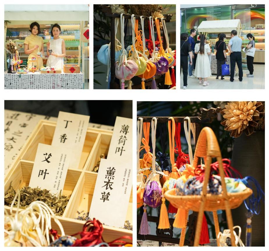 此次推出的香囊分为驱蚊包与安神包两大系列,由中医科名中医专家团队精心配制,凝聚着中医文化的智慧与心血。驱蚊包选用艾叶、薄荷等11味天然药材,既能驱避蚊虫预防传染病,又以芳香化浊之效应对梅雨湿邪;安神包则精选7味宁心药材,通过疏肝解郁帮助缓解失眠焦虑。香囊造型古朴雅致,既可佩于身畔驱虫防病,亦可悬挂于居室、车内增添雅趣,让缕缕药香守护健康。活动开展第一天,住院大楼一层大厅内即药香萦绕,端午气息浓厚。立体展示架上挂满流苏香囊,青竹屏风映着墨色书法“扈江篱与辟芷兮,纫秋兰以为佩”,展台间青翠药草斜倚,暖光点点映衬刺绣花纹,节日雅韵随清风药香沁入心扉。
