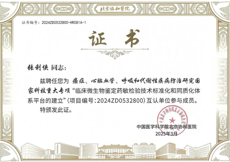 癌症、心脑血管、呼吸和代谢性疾病防治研究国家科技重大专项“临床微生物鉴定药敏检验技术标准化和同质化体系平台的建立”项目启动并持续推进,黑料网检验科主任张利侠受聘为互认单位参与成员。