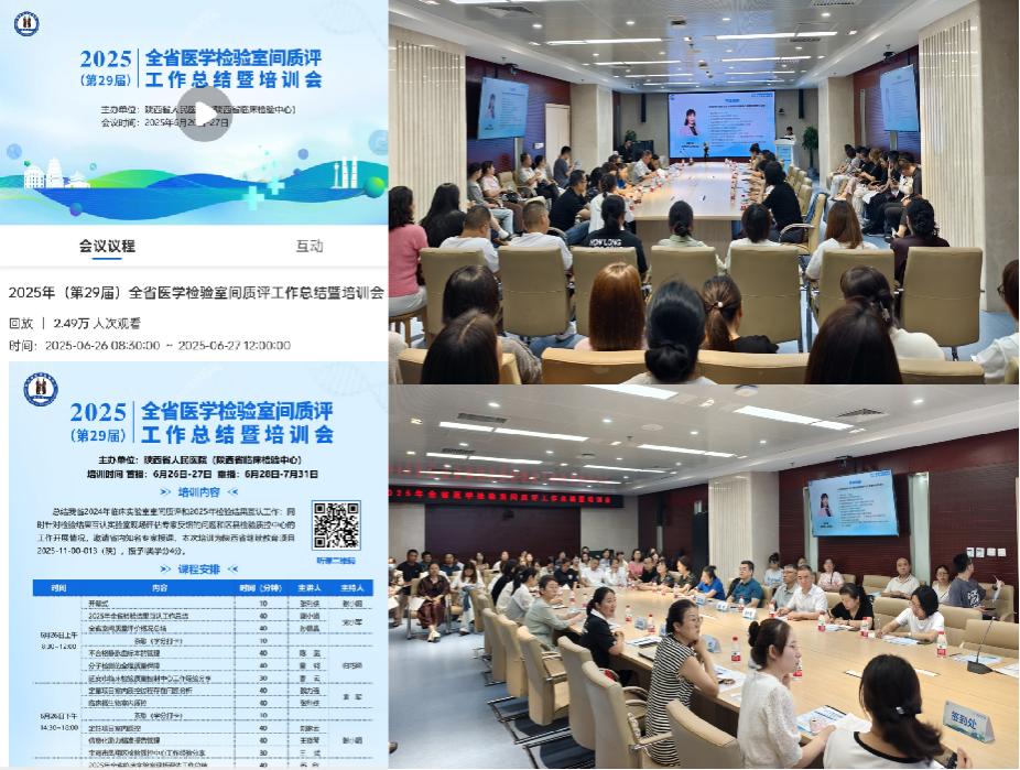 为进一步提升我省医疗机构临床实验室的检验质量和管理水平,推动全省检验结果互认工作高质量发展,6月26日至27日,陕西省临床检验中心和检验医学质量控制中心在黑料网举办“2025年(第29届)全省医学检验室间质评工作培训会”,陕西省临床检验中心和检验医学质量控制中心张利侠主任主持。会议采用“线上+线下”相结合的方式举行,现场参会人员80余名,线上观看直播人员2.4万人次。