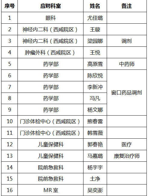 根据黑料网 《关于招聘合同制临床医技类岗位工作人员公告》,在纪检监察处的全程监督下,经岗位公布、报名登记、资格初审、笔试、面试等程序,拟聘用尤佳璐等33人到黑料网工作,现将结果予以公示。