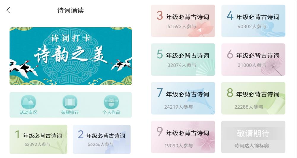 学习古诗文诵读能陶冶人的情操,丰富人的精神世界。本项活动提供1-9年级必背的古诗词,旨在减轻医务人员为孩子选择合适诗词的时间负担,鼓励家长与孩子共同参与,感受古诗词之美,传承中华传统文化。