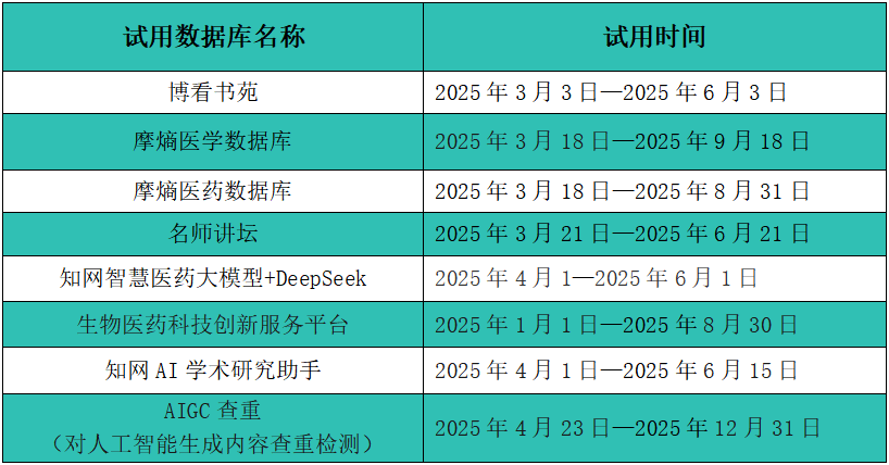 为丰富读者资源,图书馆提供多个数据库的试用机会,具体试用时间及方式将通过院内各服务群发布。
