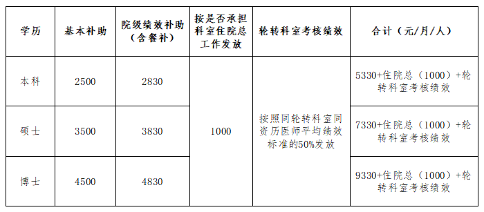 1.本着“同工同酬”的原则,参照同等条件的主治医师生活补助标准发放生活基本补助和绩效补助,参与科室绩效分配。具体发放办法见下表: