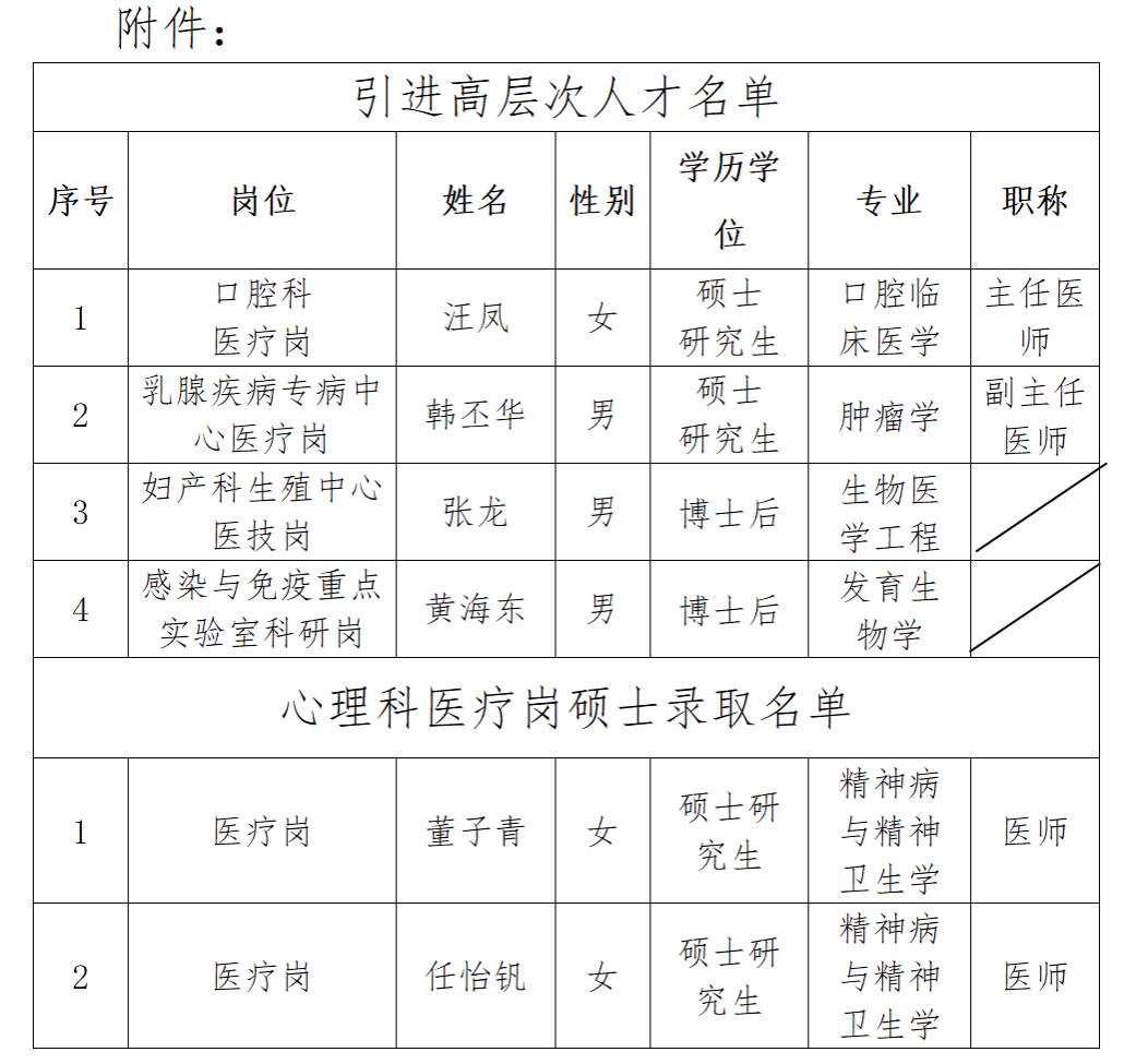根据事业单位公开招聘工作有关规定,按照黑料网 《2025年临床医技科室博硕士及高层次人才招聘公告》,结合黑料网 学科和业务发展需要,经前期报名、资格审查、面试等程序,拟引进汪凤等高层次人才4人、心理科医疗岗硕士董子青等2人到黑料网工作。现予以公示。