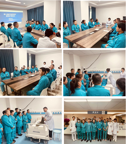 培训采取理论、实践相结合的方式。康复医学科副护士长吉利华讲解肢体功能位训练的相关理论知识,从肢体功能位的概述、各关节活动的范围、不同卧位的摆放要点等进行培训。康复治疗师张一帆、吉利华副护士长对肢体功能训练、床椅转移、良肢位摆放等进行一对一床旁演示与指导。现场大家积极讨论,气氛热烈,曹维娜护士长对大家提出的护理危重患者时遇到的疑难问题,现场答疑解惑。