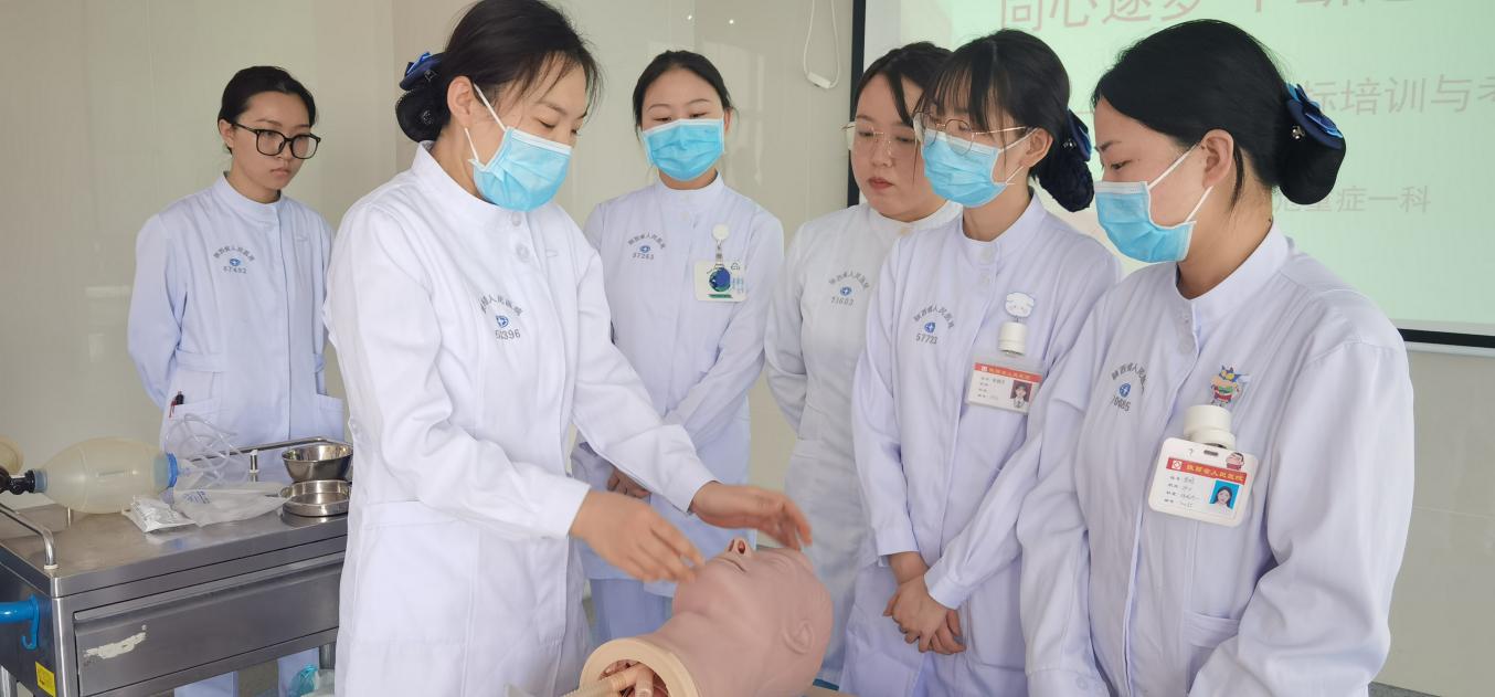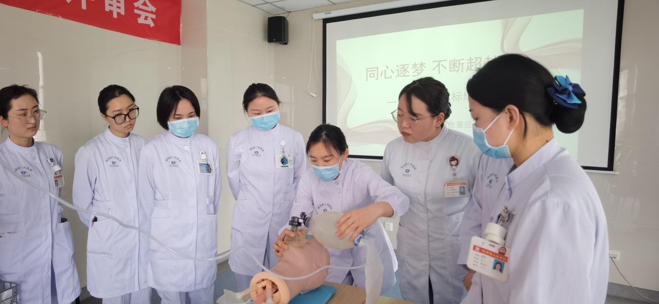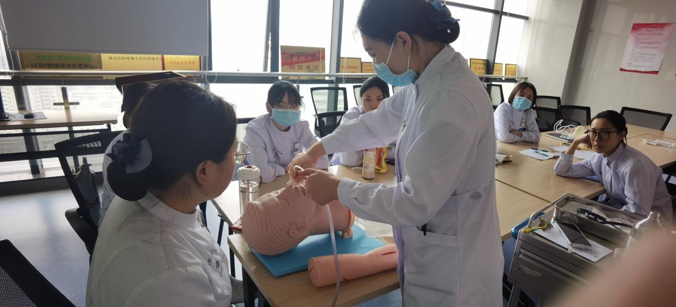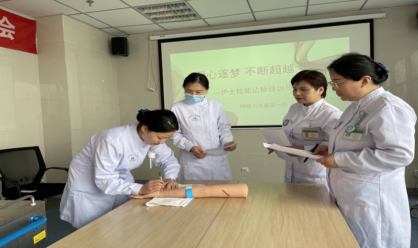 李英护士长提出目标要求,强调要人人高度重视、严格考核,最终全员达标。本次培训项目包括吸痰、动脉采血、静脉留置针穿刺及微量泵、无创呼吸机、简易呼吸器的使用,由技能组长赵璐负责培训指导。现场气氛非常活跃,大家刻苦练习,强化护理技能,确保顺利通过。