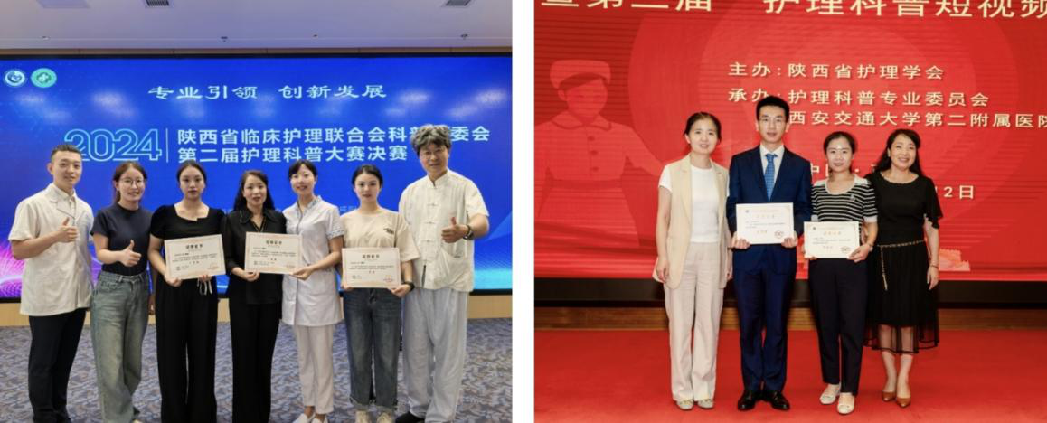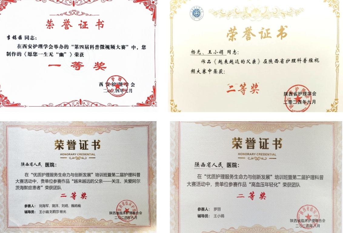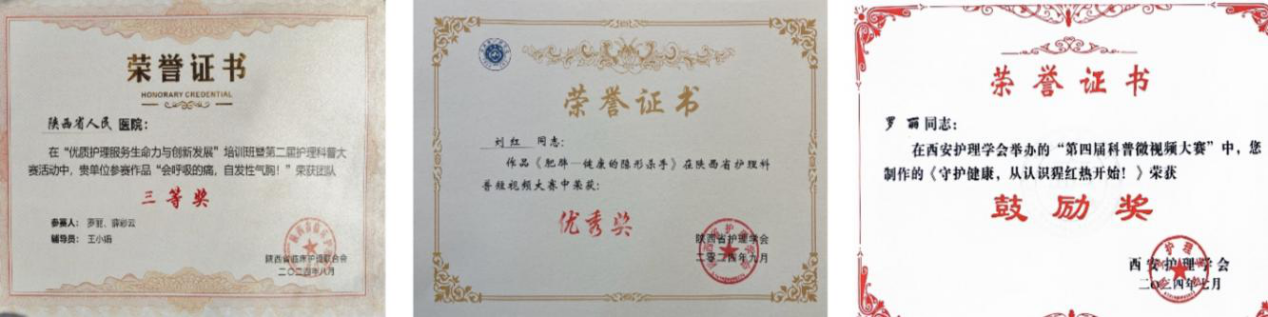 小组成员一直热衷于创造高质量的科普作品,到目前为止,科普护理小组共荣获8项荣誉,其中一等奖1项,二等奖3项,三等奖1项,优秀奖1项及鼓励奖1项。由杨光、刘丽莎、杨祎、刘海军、院洋、刘玥以情景剧参演的阿尔茨海默症科普作品——《越来越远的父亲》在陕西省护理学会、陕西省临床护理联合会科普大赛中均获得二等奖;由李镐茜、刘丽莎、杨祎、刘阳、李梦娇参演的科普作品《愿您一生无幽》获得西安市护理学会科普大赛一等奖;由罗丽制作的动漫科普作品《高血压年轻化》《会呼吸的痛——自发性气胸》分别荣获陕西省临床护理联合会科普大赛二等奖及三等奖。