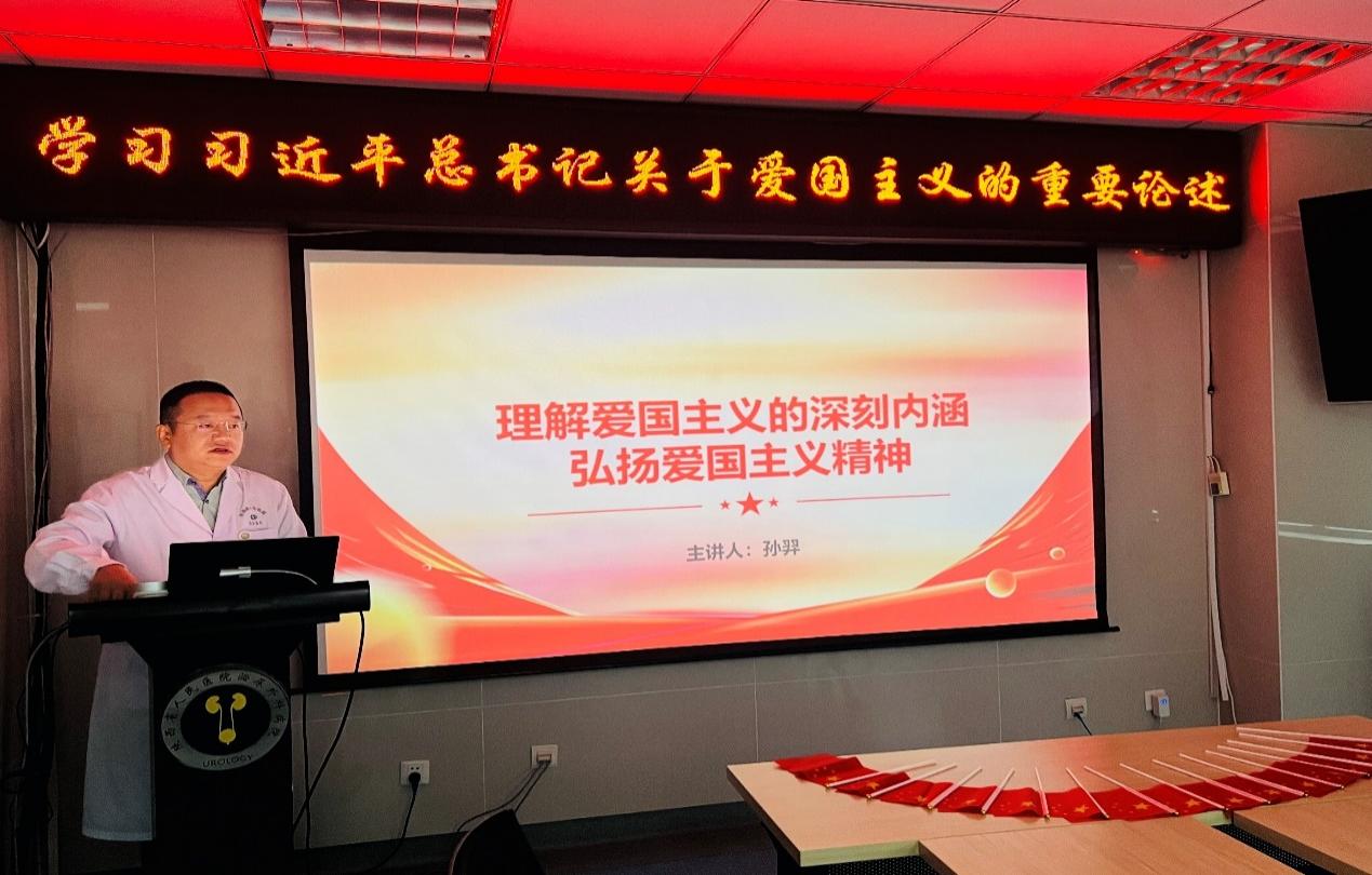 泌尿外科病院党支部书记孙羿带领大家学习习近平总书记关于爱国主义的重要论述——《从伟大抗战精神中汲取前行的力量》和《理解爱国主义的深刻内涵,弘扬爱国主义精神》等。重温历史,大家深刻体会到抗战精神凝聚起万众一心的磅礴伟力、激发出攻坚克难的强大动力、弘扬伟大的爱国奋斗精神的重要意义。