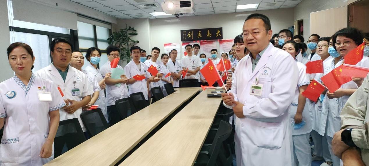党员同志们挥动手中的五星红旗,热情洋溢地唱响《我和我的祖国》,用语言表达对生命的赤诚,用歌声抒发对祖国的挚爱,祝福您,我亲爱的祖国!我们将医心向党,凝心聚力,为百姓健康保驾护航!