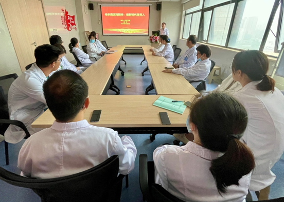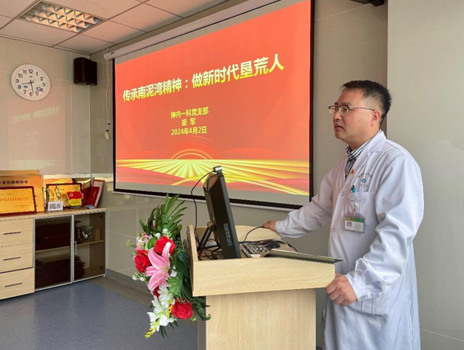临床科室标杆党支部,支部书记胡军随行并深受鼓舞。为促进党建与业务深度融合,在临床医疗工作中践行延安精神,神内一科党支部精心策划了系列主题学习活动,分别以自力更生、艰苦奋斗的创业精神,全心全意为人民服务的根本宗旨,解放思想、实事求是的思想路线,坚定正确的政治方向为主题开展四期学习活动。4月2日,支部书记胡军率先开讲,全体医护人员参加。
