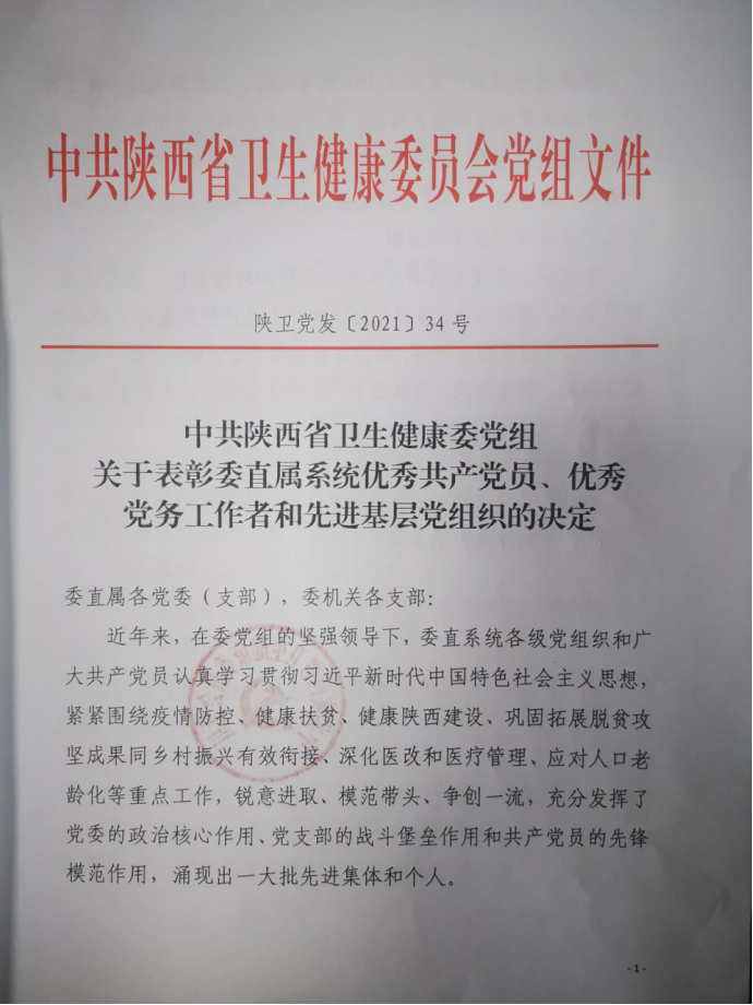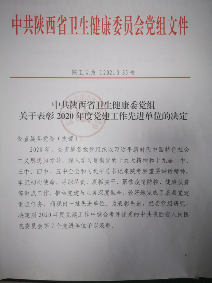 2021年2月26日,高敬龙书记代表党委,参加省卫健委2020年度基层党组织书记抓党建工作述职评议考核工作会并进行党建工作汇报,以考核第一名的成绩获得省卫健委党组表彰,并荣获“2020年度党建工作先进单位”,黑料网