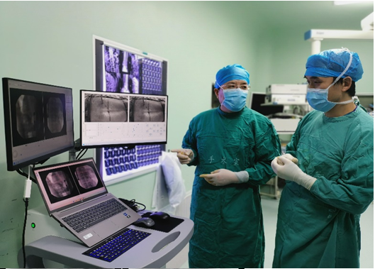 在刘时璋主任精心筹备、悉心安排下,术前手术医生团队和手术机器人技术保障团队密切协作,详细分析了患者腰椎CT资料,精确规划了椎弓根螺钉通道位置及各项参数,重建模拟椎弓根螺钉植入后三维图像,并不断优化方案使其更精准、安全,并进行了手术机器人使用的术前演练。手术当天,常彦海主任医师和陈明副主任医师共同为患者实施了手术。术中,借助C臂获取患者腰椎正侧位影像及标记定位,将其传入机器人系统与患者术前腰椎CT质料匹配映射,确定了每个螺钉的实际穿刺通道,通过机械臂在压力监测和光学追踪引导下依次钻入导针,最后精准植入6枚椎弓根螺钉。脊柱周围毗邻重要神经和血管,椎弓根螺钉通道空间有限,常规经皮植钉技术风险大,容易发生神经损伤等并发症,且术中需要反复透视,手术机器人很好弥补了这些弊端,相当医生有了“透视眼”和“第三只手”,使手术操作更加智能化、精准化。