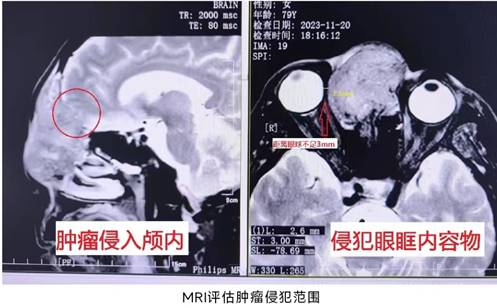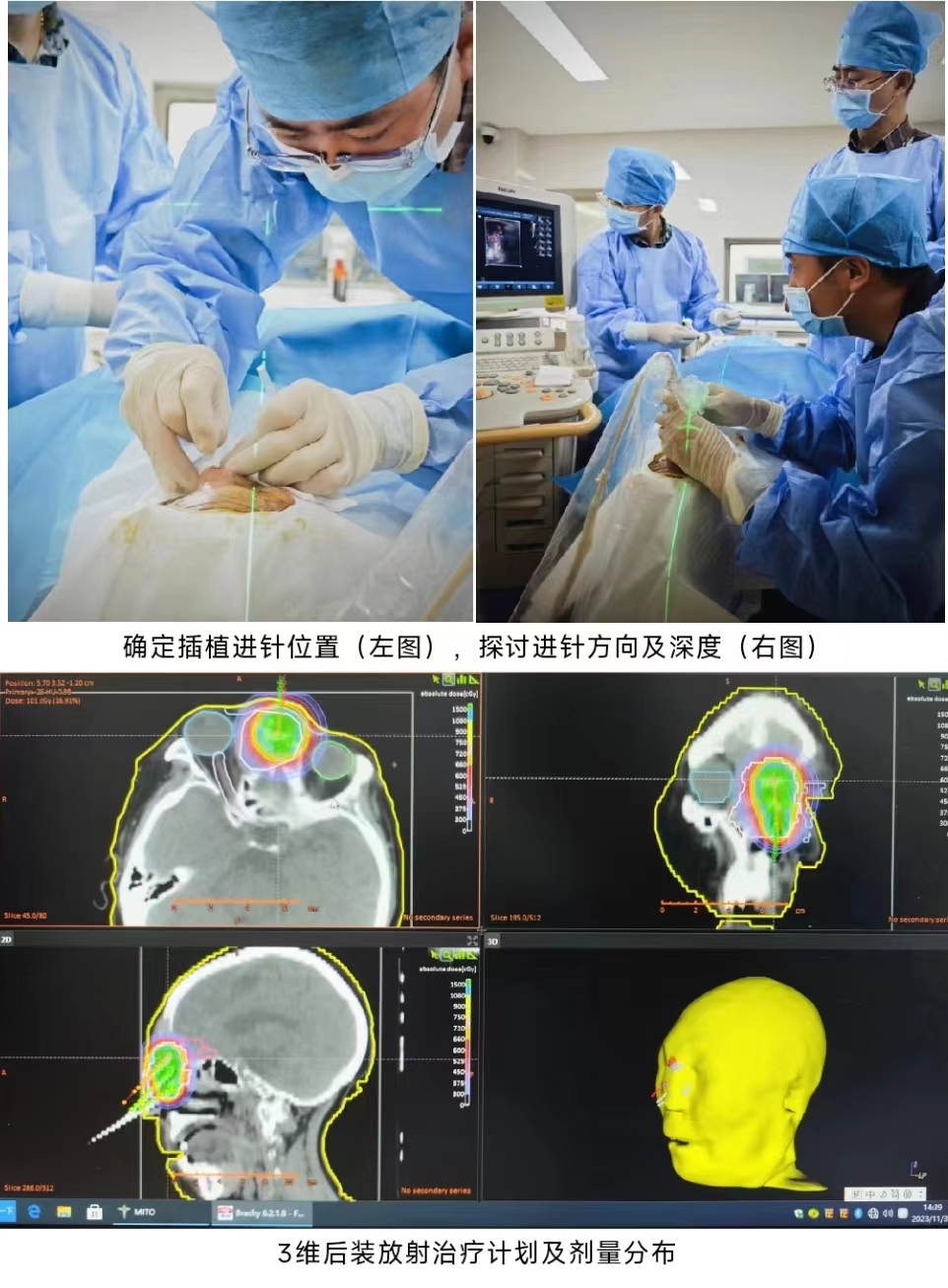本例高龄鼻窦恶性肿瘤患者入院已是局部晚期,侵犯颅内、侵入眼眶。由于患者高龄不适合高强度的系统治疗,且肿瘤位置特殊、侵犯广泛,手术及放疗难度大,给患者的治疗带来了极大的困扰。为了寻求更加安全、有效的治疗方案,耳鼻咽喉头颈外科、肿瘤内科、放疗科专家团队经过充分讨论,决定采用多维影像引导插植后装放射治疗。这是一种结合了现代影像技术、微创技术和放射治疗技术的先进治疗方法,能够在保证治疗的同时,最大限度地减少对患者正常组织的损伤,联合同期的化疗,为缩小肿瘤体积及后续根治性治疗提供可能性。术中,耳鼻咽喉头颈外科李安副主任医师及肿瘤内科段宝军副主任医师在超声联合CT的多维影像引导下,精确定位肿瘤穿刺位置。放疗科陈鑫博士在王青主任及于娇副主任医师指导下,根据患者的具体情况,制定个体化的放射治疗方案。实施过程中,李宇物理师及陈红蕾护士紧密配合,团队通过微创技术将放射治疗针道准确植入肿瘤组织中设计位点,对肿瘤进行精确照射,尽可能减少周围正常组织损伤。整个治疗过程既保证了治疗作用,又避免了传统减瘤手术、常规放疗带来的创伤和并发症风险,为后续根治性治疗的开展提供有力保障。