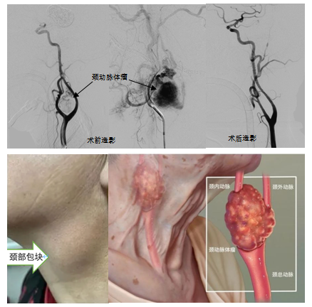 颈动脉体瘤是一种较为少见的化学感受器肿瘤,为副神经节瘤的一种,发生于颈总动脉分叉部位的颈动脉体。任何年龄均可发病,多数生长缓慢,表现出良性肿瘤的特征,其中约5%~10%属于恶性。此病主要表现为颈部下颌角下方无痛性肿块,多数生长较为缓慢,发生恶变或瘤体内变性者,短期可能迅速增大,患者亦可出现局部压迫症状,如压迫颈总动脉或颈内动脉出现头晕、耳鸣、视力模糊甚至晕厥等脑缺血症状,压迫喉返神经出现声音嘶哑、呛咳,压迫舌下神经出现伸舌偏斜,压迫交感神经出现Horner综合征,压迫气管出现呼吸困难等。少数患者合并颈动脉窦综合征,因体位改变,肿瘤压迫颈动脉窦引起心跳减慢、血压下降、晕厥等症状。部分肿块可扪及搏动和闻及血管杂音。少数病例为恶性颈动脉体瘤,肿瘤浸润周围神经,可出现声音嘶哑,饮水呛咳(迷走神经)及舌肌萎缩,舌运动受限等。此病可通过超声、CT(CTA)、MRI(MRA)及选择性颈动脉造影明确,目前治疗以手术切除为主,由于瘤体血供丰富,病变部位特殊,手术风险往往较大、术中出血较多,主要手术方式有肿瘤剥离术、肿瘤切除并血管重建术及肿瘤切除并血管结扎术。