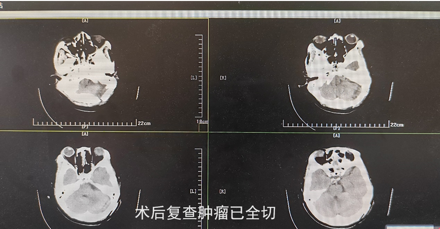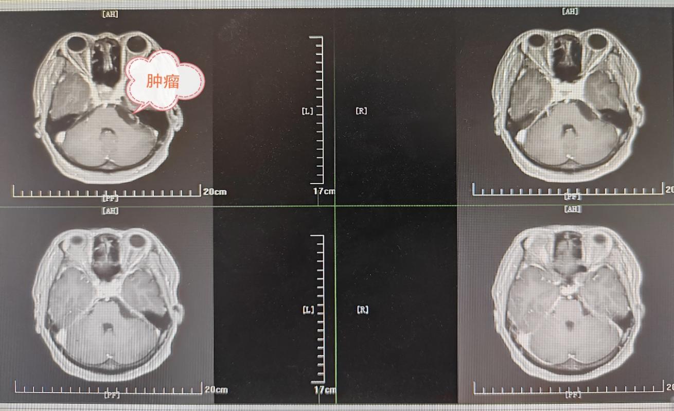 患者为中年女性,以面部疼痛症状入院,面对三叉神经痛为症状患者,经过检查,发现患者为右侧桥小脑角区长有一约4*1.5cm肿瘤。肿瘤沿桥小脑角间隙生长,最深部到达桥脑腹侧,包绕岩静脉、基底动脉、小脑上动脉、小脑前下动脉等重要血管和动眼神经、外展神经、面神经、听神经、舌咽神经等重要颅神经,桥小脑角区域解剖关系复杂,肿瘤沿缝隙生长,常规显微镜手术很难全切肿瘤。在缪星宇主任主持下,神经外科全科经过充分术前讨论后制定了精密诊疗方案,决定采用“双镜联合技术”切除肿瘤,这是国内部分先进医疗中心探索应用的技术,显微镜联合应用神经内镜,发挥最大优势;以显微镜清晰的三维成像为基础,利用神经内镜抵近观察和绕角观察的特性暴露深部肿瘤,既能发现并全切深部间隙隐藏肿瘤,又能在神经内镜直视下精准保护重要神经血管。手术由缪星宇主任医师、孟发财副主任医师、刘凯飞主治医师共同完成,经过5小时紧张有序的手术,血管神经保护良好,患者颅内肿瘤顺利全切,术后复查肿瘤全切,患者恢复良好出院。