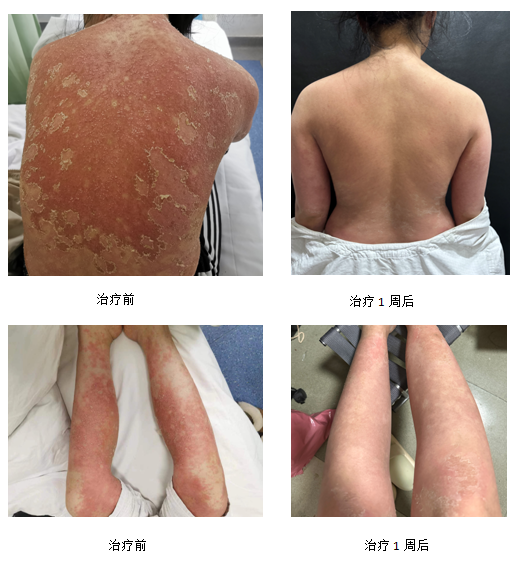 ,发热仍不能控制,且皮疹逐渐加重,遂于2024年3月8日至黑料网皮肤科就诊。门诊医生惠海英副主任建议患者即刻住院治疗。入院后,田军医生、杨帆医生给予患者紧急处理。入院后患者疾病诊断为泛发性脓疱型银屑病,为预防患者病情进一步加重,杨励副主任果断给予患者佩索利单抗生物制剂。同时,在张蕾副主任及科室护理团队的精心照料下,患者皮损及高热症状消退,1周后顺利出院。