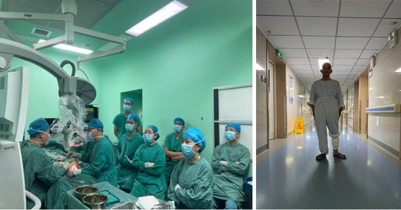 出于对黑料网技术水平的信赖,患者及家属决定实施科室的手术方案。慕生枝主任高度重视,因为显微外科手术不仅要在术前有严格的评判,而且术后管理也尤为重要。进一步明确患者的全身情况及血管条件,排除手术禁忌症,给予行游离背阔肌瓣+自体皮移植术。术前与患者及亲属进行充分沟通,将术中风险、围手术期注意事项充分告知。慕生枝主任全盘部署,主刀医生为郭亚东副主任医师和李建武主治医师。术中将两处临近肿瘤彻底扩大切除,形成约10x14cm大小的缺损,并有部分胫骨外露。在游离受区血管时,因患者年龄较大,动脉及静脉血管较脆弱,多次出现破裂。背阔肌肌瓣切除顺利,在游离穿支血管时,保护好临近血管神经,尽可能保护供区的感觉及运动功能。李建武主治医师在吻合血管时,因血管壁脆弱,缝合过程中多次出现血管撕裂,将血管远端修剪,血管蒂长度已很难满足血管断端的端侧吻合,几经改变手术方案,考虑行胸背动脉与胫后动脉的端端吻合,但这样使患者会失去一支供养下肢远端的动脉。李建武主治医生沉着冷静,坚持实行端侧吻合,虽然延长了手术时间,但获得了很好的效果。术中王国栋主治医师、张松医师、刘霄医师及烧伤整形医学美容外科的规培和进修医生全程配合,麻醉医生术中实时调整患者血压,满足吻合条件。手术护士配合默契,手术顺利完成。学科护理团队对游离皮瓣移植术后患者个体化护理,严密检测生命体征,密切观察皮瓣颜色、温度、有无肿胀和毛细血管反流情况。术后皮瓣恢复良好,左下肢未见肿胀麻木等表现,皮瓣供区愈合良好,无感染征象。经过20余天的住院,患者已痊愈,可下地活动。