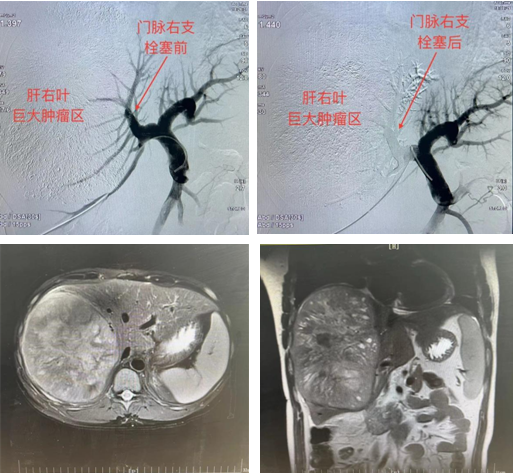 经与患者家属充分沟通、知情告知后,开始实施阶梯式治疗方案。由于前两步治疗的顺利完成,第三步经皮门静脉栓塞术(PVE)也很快实施。PVE术前由超声诊断中心关蕾医师引导,微创介入科颜昭勇医师穿刺门静脉成功,其后微创介入团队先后行门静脉造影、门静脉右支主干及其分支(肿瘤侧)充分栓塞。造影显示肿瘤侧门脉显影消失,提示门脉栓塞成功,手术顺利结束,患者安返病房。