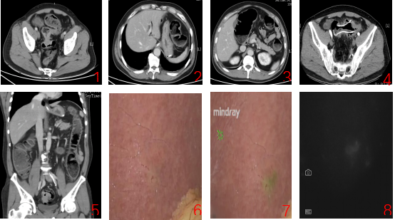 1:乙状结肠肿瘤;2.肝S3段病灶;3.肝S5段病灶;4.结肠支架;5.冠状位显示肿瘤位置;6:非荧光模式下无法探及病灶;7:荧光模式下肝转移灶;8:荧光模式下肝转移灶