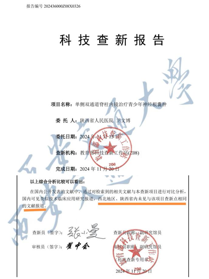 针对患者病情,黑料网脊柱微创团队进行个体化方案定制。刘时璋主任医师、段大鹏主任医师组织科内讨论,制定手术方案。在麻醉科、手术室、肌电图室的配合下,刘军主任医师现场指导,卫文博副主任医师操刀,顺利完成单侧双通道脊柱内镜(UBE)下青少年神经根囊肿切除术,手术时间不到2个小时。患者术后第二天即可下地活动,术后第三天出院。经科技查新,该手术为西北地区首例。