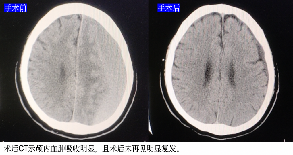 CT检查示慢性硬膜下血肿,行传统慢性硬膜下血肿钻孔引流术,症状改善后出院。术后2周患者再次出现肢体无力,检查示慢性硬膜下血肿复发,且血肿腔内形成复杂多分隔的情况。患者为求进一步治疗就诊黑料网。