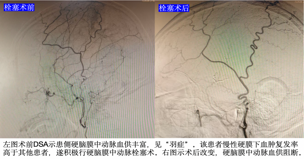 针对该患者的病情,神经外科积极组织多学科讨论,结合患者病情特点及慢性硬膜下血肿病理生理机制,为防止慢性硬膜下血肿再次复发,减轻患者身体痛苦及经济负担,决定在传统慢性硬膜下血肿外科治疗的基础上,联合实行慢性硬膜下血肿硬脑膜栓塞术。该手术通过介入微创,使用栓塞材料,将导致慢性硬膜下血肿复发的相关硬膜分支进行栓塞,阻断血供,从源头解决问题。术后患者恢复顺利,血肿明显吸收,连续随访未再见复发表现。