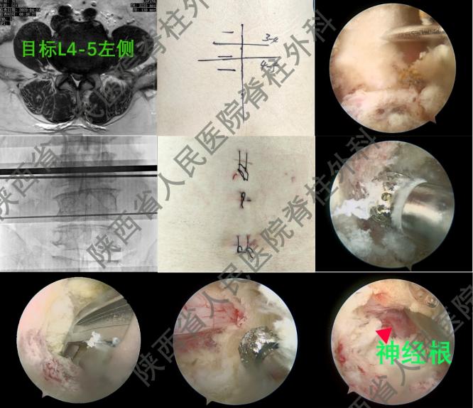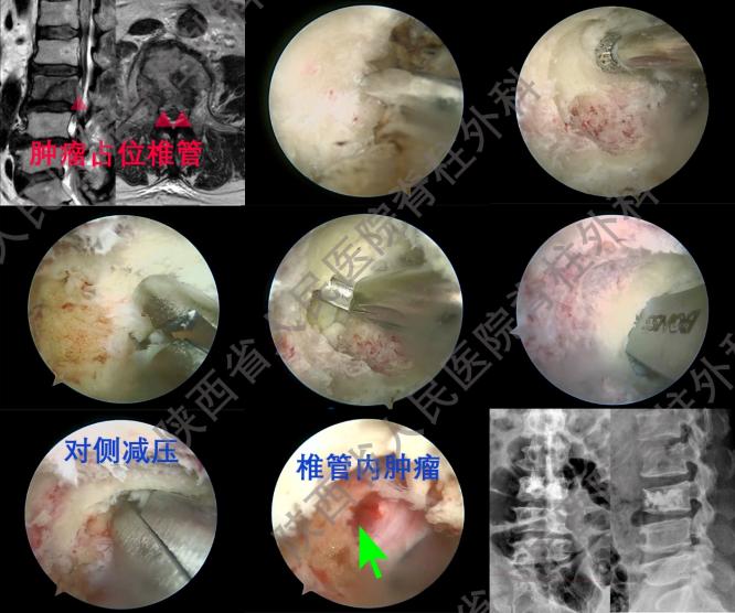 考虑到患者病变多,病情复杂,骨科病院刘时璋主任组织开展了科室病例讨论。综合分析患者病情,刘时璋主任提出此患者应该采用个体化、微创化的治疗方案,结合黑料网陕西省UBE技术联盟的技术优势,确保手术实施的可行性。术前,陈明副主任医师和李智斌主任医师进行了精心准备。5月14日,在麻醉科的全力支持下,西咸院区骨科团队孙正明主任医师、武世勋主治医师共同为患者顺利进行了手术。手术通过建立腰4-5间隙UBE通道在内镜下首先完成腰4-5椎管减压神经松解术,然后再建立腰3-4间隙UBE通道进行腰3椎管内肿瘤切除椎管减压,最后在内镜监视下完成腰3椎体强化术,避免骨水泥渗漏。手术共4小时,术后患者疼痛及麻木症状明显缓解。