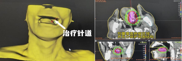 在本次新技术的开展过程中,放疗科与口腔科、麻醉科、耳鼻喉头颈外科等组成多学科诊疗团队,口腔科李建虎副主任医师评估该患者不具备切手术可能性,经过充分的术前评估和讨论,为患者制定了可行的个性化插植路径方案。在插植过程中,口腔科张鹏医师完成双侧下颌神经阻滞麻醉后,放疗科陈鑫副主任、曹席明医师将施源器精准植入舌体深部肿瘤位置,并精确勾画治疗范围及需保护结构。随后,李宇物理师及刘国强物理师根据患者具体情况,精心设计放疗方案,确保消融性剂量精确覆盖于肿瘤组织,同时最大限度地保护周围正常组织,紧密的团队协作确保患者顺利完成治疗。术后,陈红蕾护士精心完成患者陪护、心理安抚及插植针维护等工作。