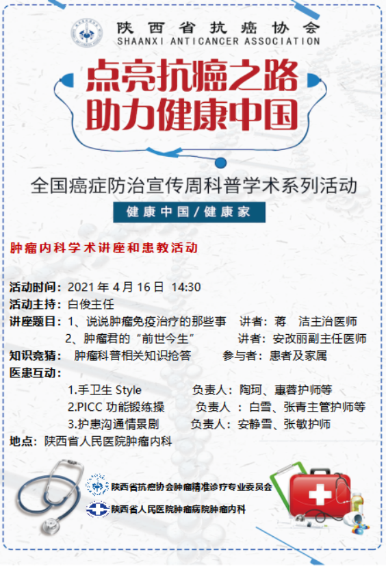2021年4月15~21日是第27个“全国肿瘤防治宣传周”,为提高全社会癌症防控意识,助力健康中国、健康陕西、健康黑料网