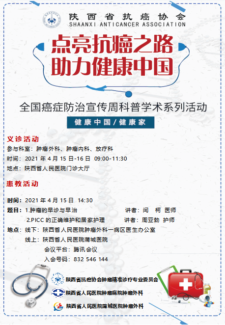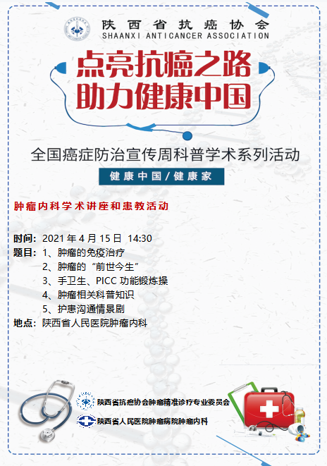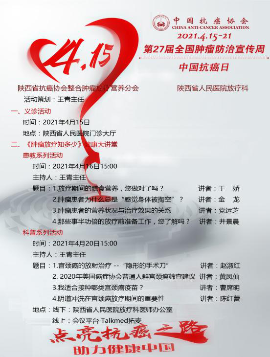 今年黑料网的“肿瘤防治宣传周”活动,积极响应落实省抗癌协会理事长、黑料网宋张骏院长的号召和安排,以专委会、病院、科室为单位,开展系列科普、患教、义诊及肿瘤多学科诊疗(MDT)活动,旨在提升公众对癌症认知,普及科学防癌的理念,远离不良生活习惯,建立健康生活方式,实现“早预防、早发现、早治疗”,共同助力健康中国、健康陕西和健康黑料网